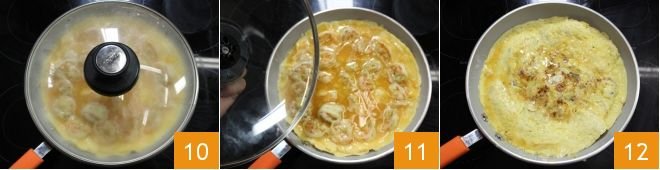 Let everything cook for 2 minutes over low heat, then cover with a lid 10 and continue cooking for 5-6 minutes until the surface is sufficiently set. At this point, flip the frittata with the help of the lid 11 or a plate, turning it over and sliding it back into the pan, and let the other side cook for another 2 minutes without a lid. When the frittata has a denser consistency and a deeper color 12, turn off the heat, plate your prawn frittata, and serve it hot or cold!