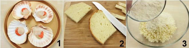 To prepare Provençal-style gratinated scallops, start by placing the scallops in an oven dish with the shell facing down 1. To keep them upright and prevent the stuffing from coming out of the shell, you can make a support this way: cut sheets of aluminum foil 8 inches long and roll them onto themselves until obtaining a stick, then join the two ends to form a ring, and place it under each scallop. Prepare the stuffing: remove the crust from the Italian bread and crumble it with the help of a mixer, then place it in a bowl and add the grated Parmesan and crushed garlic (2-3).