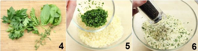 Now take the herbs (parsley, basil, marjoram, and thyme) and chop them 4. Mix them with the bread 5, add salt and pepper 6