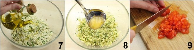 and add the oil, reserving a few tablespoons 7. To better amalgamate the mixture, add the vegetable broth until you obtain a dense mixture, neither too liquid nor too solid 8. At this point, cut the cherry tomatoes into cubes 9