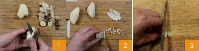 To prepare the puff pastries with olives, Jerusalem artichoke, and raspadura, start by cleaning the Jerusalem artichoke, removing the outer skin with a small knife 1, then cut it into very small cubes 2. Next, peel the garlic and chop it 3, you can also sauté it whole in the pan if you prefer to remove it later.