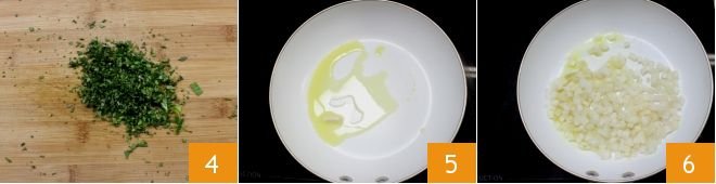 Also finely chop a bunch of parsley 4 then in a large pan, pour a drizzle of oil 5 and add the Jerusalem artichoke 6 and the garlic whole or chopped.