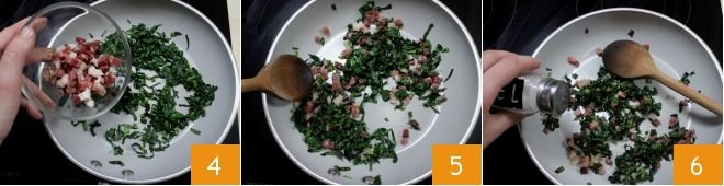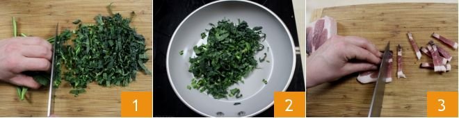 To prepare the puff pastries with speck and black cabbage, start by washing the black cabbage under running water. Remove the outer leaves if they have imperfections and are too tough, then cut the other leaves into julienne strips 1. Drizzle a large pan with a little oil and add the cabbage strips 2: let the black cabbage wilt for about 5 minutes. Meanwhile, cut the speck into cubes of the same size 3.
