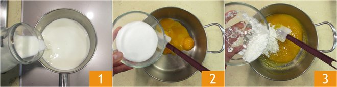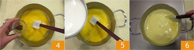 Flavor with vanilla extract 4. Now pour a little hot milk into the egg yolk, sugar, and cornstarch mixture to temper and mix. 5 Then pour in the remaining milk, mix, and return to low heat 6. Bring to a boil, stirring often 6.