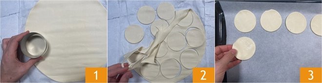 To make the puff pastry mini pizzas, roll out the puff pastry sheet on the work surface and cut it out with a 2.75-inch cookie cutter 1: you will get about 14 discs 2. Transfer the discs to a baking tray lined with parchment paper, spacing them a few inches apart 3