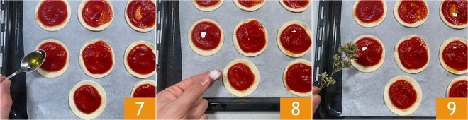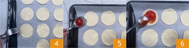Prick the puff pastry with a fork 4. Spread a tablespoon of tomato sauce on each disc 5, then season with a dash of oil 6.