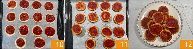 Bake in a preheated static oven at 390°F for about 20 minutes 10. When they're beautifully golden, remove them from the oven and let them cool slightly 11. Your puff pastry mini pizzas are ready to be enjoyed 12!