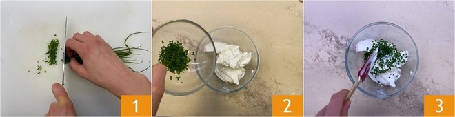 To prepare the puff pastry pinwheels, first chop the chives 1. Add them to the cream cheese in a small bowl 2 and mix 3.