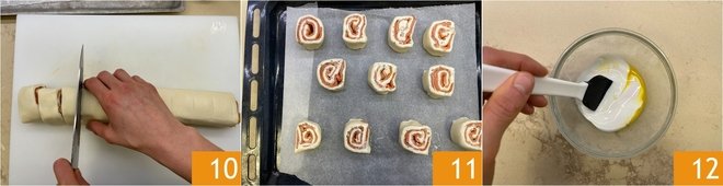 When the pastry has firmed up, use a sharp knife to cut 12 pinwheels from each roll, about 3 cm thick (about 1 3/16 inches); you will obtain 24 puff pastry pinwheels in total. Arrange them on a baking sheet lined with parchment paper as you go, with the cut side facing up and well spaced apart 11. Now mix the egg yolk and cream together 12.