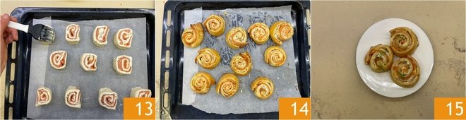 Brush the pinwheels with this mixture 13. Bake at 356°F in a preheated conventional oven for 35 minutes or until golden. Remove from the oven and let cool slightly 14. Garnish with chopped dill and serve your puff pastry pinwheels 15!