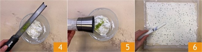 Add the grated lime zest 4 and a pinch of salt 5. Unroll both pastry sheets on a work surface and spread them with the cream cheese using a small spatula, taking care to leave the edge free along the long side 6.