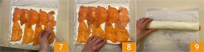 Lay the salmon slices on top 7, then roll the pastry up from the long side 8 so as to form a cylinder 9. During this process the pastry may have become too soft; in this case, place the cylinder in the refrigerator for a few minutes to firm it up before cutting it.