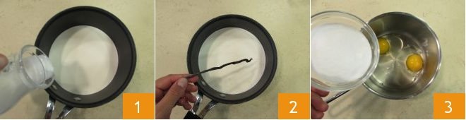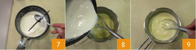 When the milk is almost boiling, remove it from the heat and discard the vanilla pod 7. Then slowly pour it into the other saucepan 8, stirring constantly with the whisk 9.
