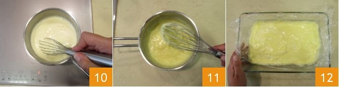 Put the saucepan back on the heat 10 and continue stirring for about 3 minutes until the cream thickens 11. Then transfer it to a baking dish and cover it with plastic wrap touching the surface 12. Let it cool first at room temperature and then in the refrigerator, then place it in a piping bag.