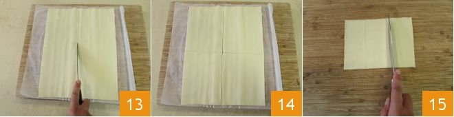 When the cream is completely cold, roll out the puff pastry and divide it into 4 rectangles (13-14). Take one of the rectangles and further divide it into 3 sections, widthwise; you shouldn't cut through the pastry completely, just create a sort of guide for the next step 15.