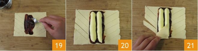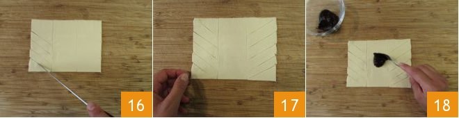 Cut 6 diagonal strips of 0.6 inches on the two outer rectangles (16-17). Put a teaspoon of jam on the central rectangle 18