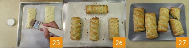 Once you have finished making them, brush with milk 25 and bake in a preheated static oven at 356°F for 15 minutes. Once golden brown, take your puff pastry twists out of the oven 26 and serve 27!