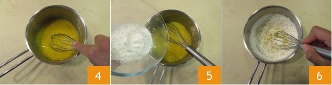 Quickly beat everything with a whisk 4, then add the cornstarch 5 and stir to absorb it 6.