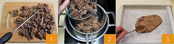 To prepare the puffed rice and chocolate bars, start by roughly chopping all the chocolate with a knife 1; you can use milk chocolate, white chocolate, or dark chocolate according to your tastes. The amounts of chocolate pieces obtained will be divided for different preparations: place 3.5 oz of the chopped chocolate to melt in a double boiler, stirring occasionally with a spoon 2. Meanwhile, line a rectangular baking dish measuring 12x9 inches with parchment paper. When the chocolate is melted, pour it gently onto the baking dish 3.