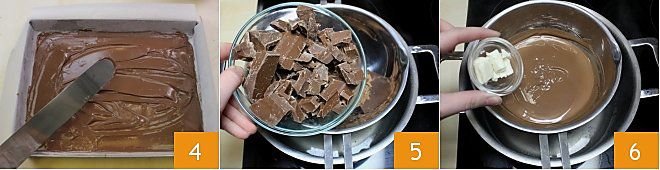 Spread the chocolate over the entire surface of the baking dish using a spatula or the back of a spoon 4. Then, as in the previous sequence, proceed to melt 10.5 oz of chocolate to be combined with the puffed rice in a double boiler 5. When it's melted, add the butter and mix (you can also omit it if you prefer) 6.