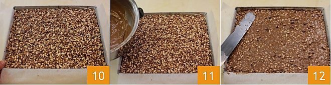 When you have evenly distributed the mixture over the entire surface of the baking dish 10, let it cool slightly. Meanwhile, start preparing the topping: melt the remaining 5.3 oz of chocolate in a double boiler, when it is melted, pour it directly over the puffed rice 11. With the help of a spatula or the back of a spoon, gently spread it over the entire surface of the puffed rice until it is completely covered 12.
