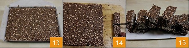 Let the obtained mixture solidify outside the fridge for 4-5 hours, so it compacts while remaining soft 13. Then turn it out and place it on a cutting board to make bars of 1.2x3.1 inches (14-15). You can enjoy your puffed rice and chocolate bars as a snack or a treat during the day!