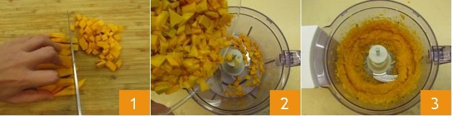 To prepare the pumpkin and chocolate cake, clean the pumpkin by removing the internal seeds and skin, then cut the pulp into cubes 1, you will get about 480 grams (17 oz). Transfer it into a food processor with blades 2 and blend until you get a puree 3.