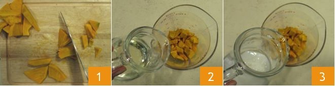 To prepare the pumpkin and chocolate tartlets, first clean the pumpkin and cut it into chunks 1: you will need 160 grams of cleaned pumpkin. Transfer the pumpkin to a tall, narrow container, add the seed oil 2 and almond milk 3