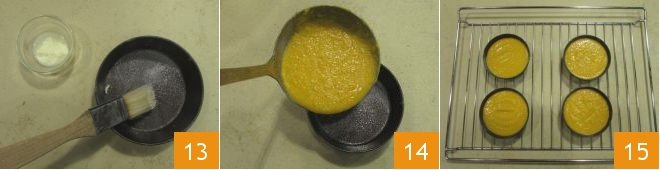 Butter 13 and flour 4 round molds with a diameter of 4 inches and a height of 1.2 inches, fill them with the mixture up to three-quarters 14, and place them on the oven rack that you have preheated to 340°F in static mode 15. Bake the tartlets for about 20 minutes.