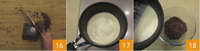 In the meantime, prepare the ganache: finely chop the dark chocolate with a knife 16, then pour the cream into a saucepan and bring it to a simmer 17. Transfer the chopped chocolate into a bowl, pour the hot cream over the chocolate 18