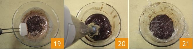 and mix vigorously with a spatula until you obtain a cream 19. Blend the obtained cream with an immersion blender to make it smoother and shinier 20, then cover it with cling film touching the surface 21 and let it cool in the refrigerator for at least 30 minutes.
