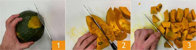 To prepare the pumpkin and goat cheese velouté, first remove the pumpkin skin 1 and eliminate the seeds and inner fibers. Slice it into pieces 2 and then into cubes 3.