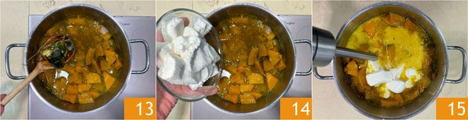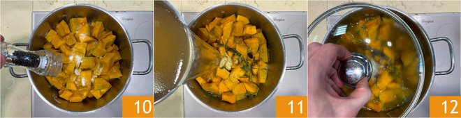 Adjust with salt and pepper 10. Pour in the vegetable broth 11, bring to a boil then lower the heat, cover with a lid 12, and let it cook for 20 minutes or until the pumpkin is tender.