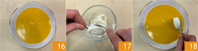 Plate the velouté 16. For each dish, create 3 small quenelles with the goat cheese using two teaspoons 17 and place them on the velouté 18.