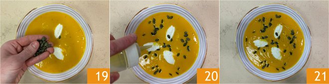 Finish with toasted pumpkin seeds 19 and a drizzle of oil 20. Your pumpkin and goat cheese velouté is ready to be served 21.