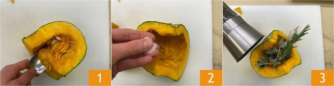 To prepare the pumpkin risotto, start by cutting the pumpkin in half: cut off a slice weighing about 3.5 oz and set it aside, then remove the flesh and inner seeds from the rest 1. Season with salt 2, pepper, rosemary and sage 3.