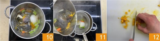 Once ready 10, strain the broth into a small saucepan 11. Now cut the reserved pumpkin slice into small dice about 1/4 inch 12.
