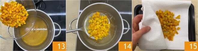 Briefly blanch the cubes in the hot broth for about 25 seconds 13. Drain 14 and gently pat dry 15.