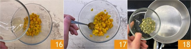 Toss the pumpkin with the apple cider vinegar 16 and mix to season 17. Toast the pumpkin seeds in a pan over medium-low heat for 7–8 minutes, or in the oven at 338°F for about 5 minutes, until crisp.