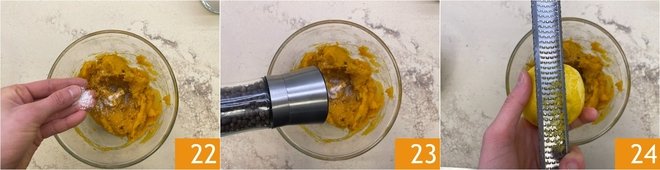 Season with salt 22 and pepper 23 and perfume with grated lemon zest 24.