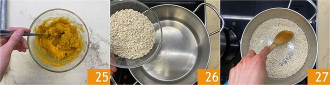 Mix and set aside 25. Dry-toast the rice in a heavy-bottomed saucepan 26 27.