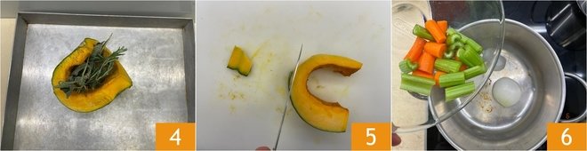 Place the pumpkin on a baking tray 4 and roast in the oven at 284°F for about 2 hours, until very soft. In the meantime, peel the reserved 3.5 oz slice of pumpkin 5; don't discard the peel, it will be used for the broth. In a saucepan, dry-toast the halved onion, then add the carrots and celery cut into large pieces 6.