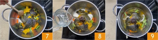 Add the pumpkin peel as well 7, then cover with about 3 cups + 3 tbsp (roughly 750 ml) of water 8 and cook for 30 minutes 9.