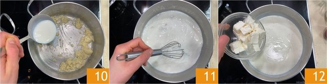 When the roux has formed, pour in the hot milk 10 and blend well with the whisk to avoid lumps 11. Let the mixture thicken over low heat, stirring continuously, then turn off the heat and add the taleggio in chunks 12.