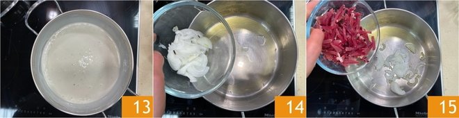 Set the béchamel aside, covered with plastic wrap in contact with it 13. Now heat the oil in a pot, add the sliced onions 14 and the speck cut into strips. Cook over medium heat for about 2-3 minutes 15.