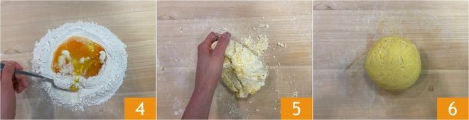 Break the eggs with a fork and incorporate them into the flour 4. Work with your hands 5 until you obtain a smooth and homogeneous dough 6. Wrap the dough in plastic wrap and set aside.