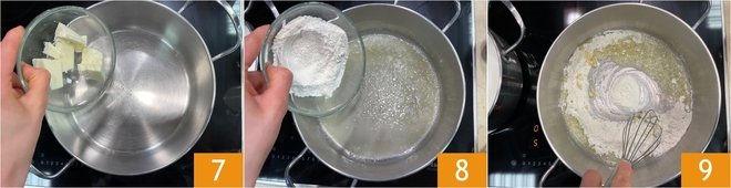 Move on to the taleggio béchamel: heat the milk in a saucepan and melt the butter in a separate pot 7. Add the flour to the melted butter all at once 8 and mix quickly with a whisk 9.