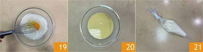 Add a pinch of salt and the egg, then mix with a whisk 19 to obtain a smooth, lump-free batter 20. Transfer the stracchino to a piping bag 21.
