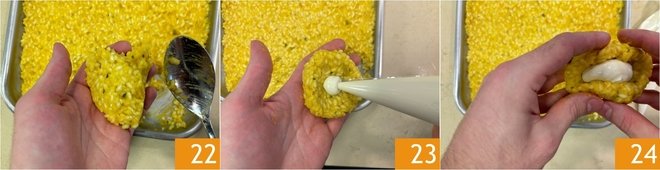 Retrieve the rice from the fridge, take a spoonful 22, flatten it to form a disk, and pipe a dollop of stracchino in the center 23. Close the disk wrapping the cheese with the rice 24.