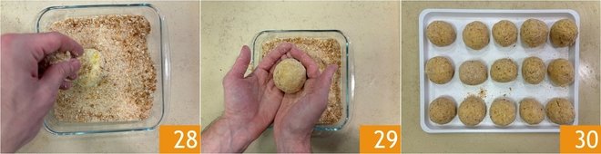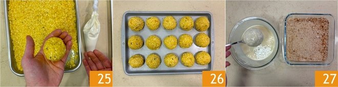 Shape into a sphere 25 and place on a tray 26. Continue this way until all ingredients are used up. Now dip the croquettes in the batter 27.